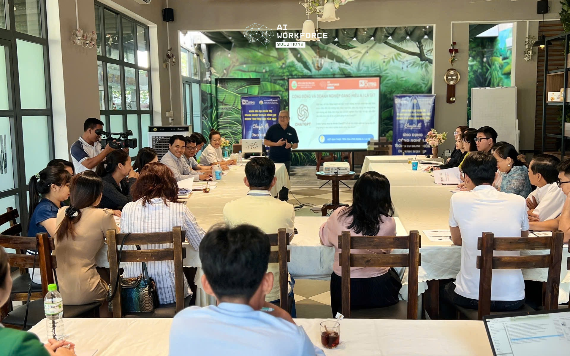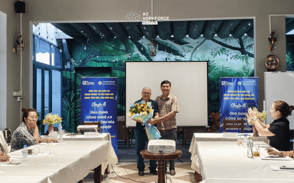 Trong khuôn khổ chương trình chuyển đổi số cho doanh nghiệp nhỏ và vừa, AI Workforce Solutions đã phối hợp cùng Sở Tài Chính tỉnh Vĩnh Long và Trường Doanh nhân Top Olympia tổ chức khóa đào tạo “AI ứng dụng 4.0” vào ngày 15/11 và 16/11.